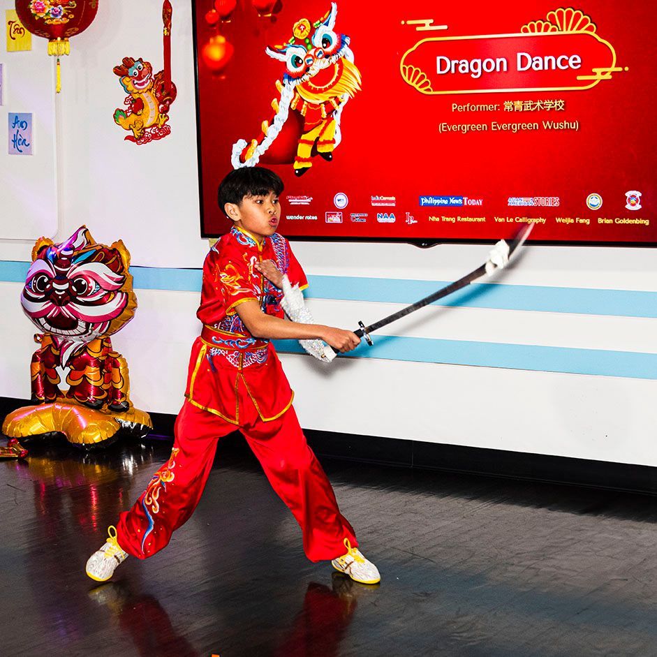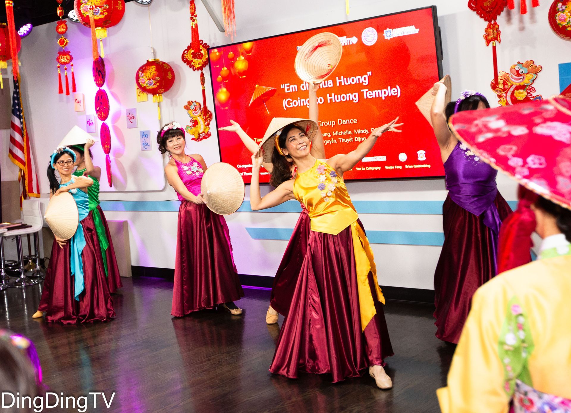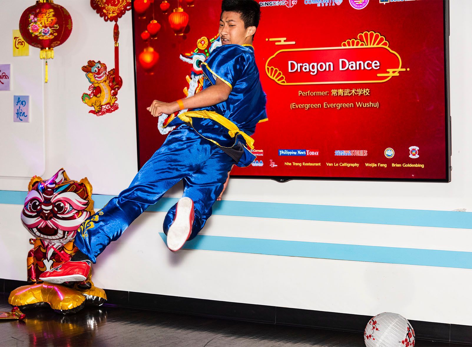 About 100 artists performed at Celebrate Lunar New Year. The performances included the Vietnamese Dance “Spring in the South” and “Em di Chua Huong,” the Korean dance Uhwudong, the Beijing opera dance, the Chinese Dragon Dance, and the Original of the Chinese Spring Festival. Young artists also performed Japanese, Vietnamese, and Chinese songs. Children in attendance received red envelopes.